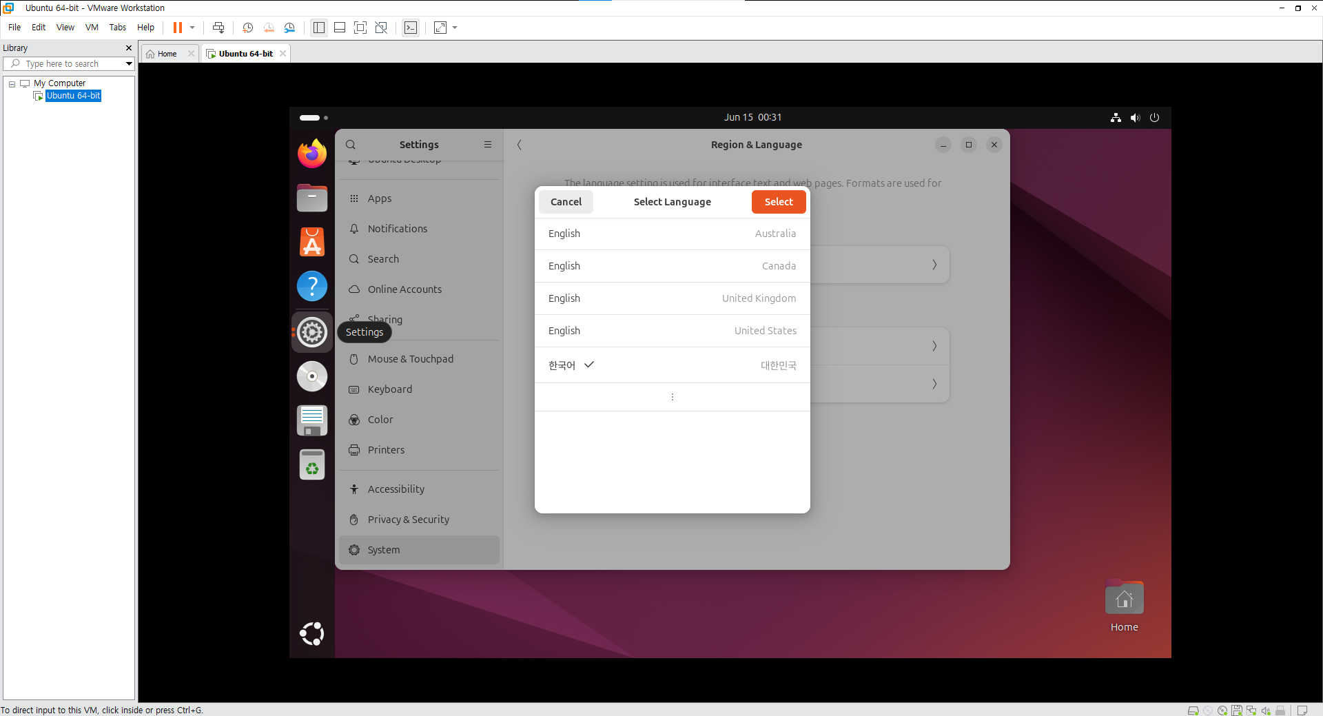 7. [System]-[Region&Language]에 들어간 후 Language 메뉴를 클릭한 후 한국어를 선택 후 상단의 Select를 클릭한다.