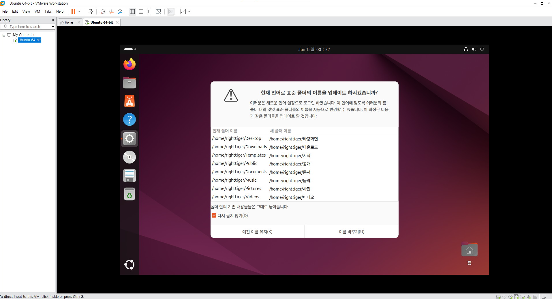 8. 설정완료 후 계정을 한번 로그아웃한 후 재접속하면 되는데, 재접속 시 나오는 현재 언어로 표준 폴더 업데이트 여부를 묻는 메시지가 뜨면 예전 이름 유지를 선택한다.(해당 내용은 발생가능한 오류를 사전 차단하기 위한 조치임.)
