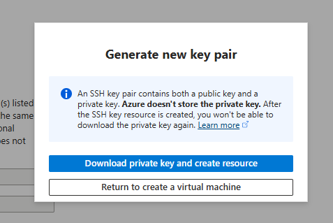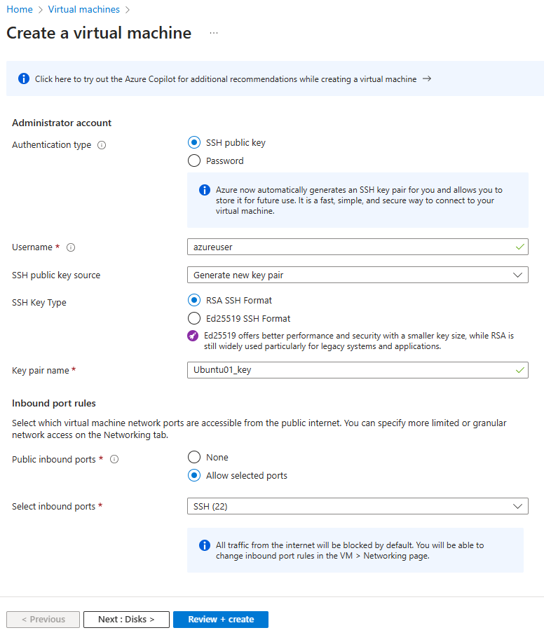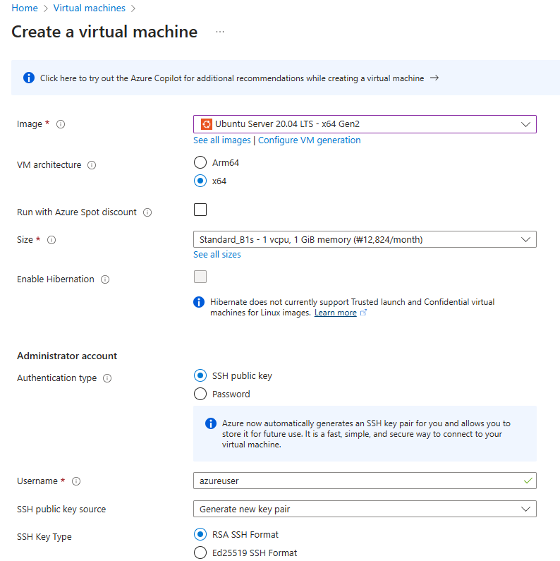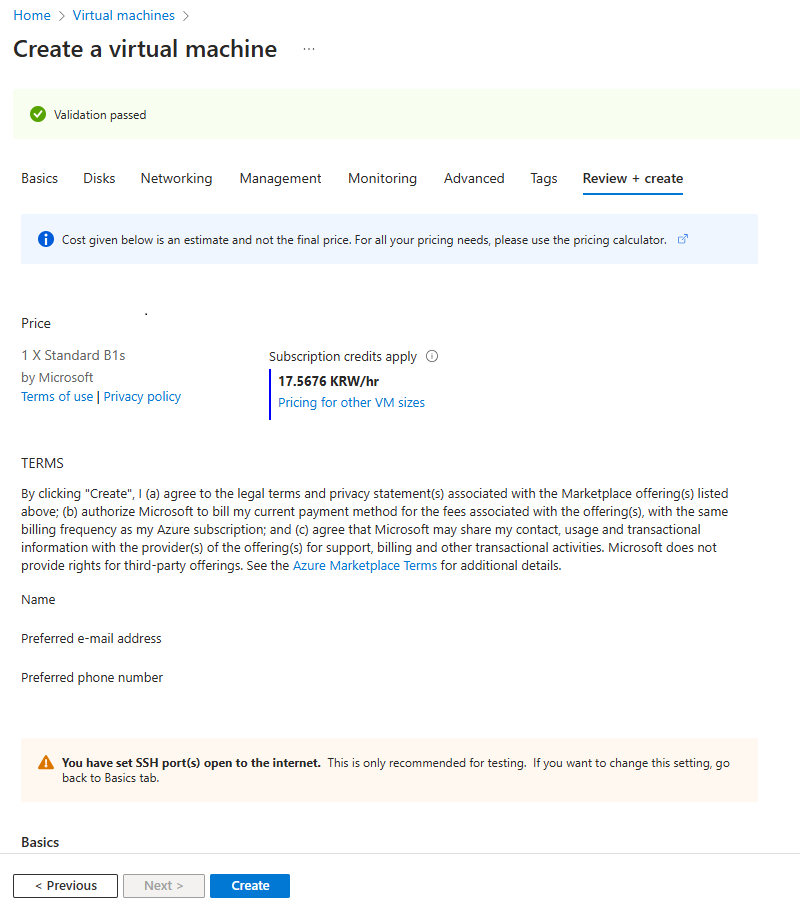 2. 상황에 맞게 VM에 적용할 Option들을 선택한 후 Review + Create를 클릭하고, 최종적으로 Create를 클릭하고 생성될 때까지 대기합니다.(접속방법을 SSH key pair로 설정했다면 반드시 private key를 접속 시에 사용하기에 해당 키를 다운로드하여 적절한 위치에 저장해야 합니다.)