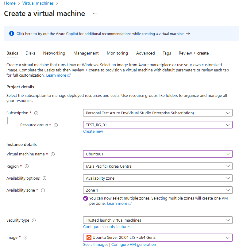 ㆍResource Group: VM 생성에 사용할 Resource Group 선택