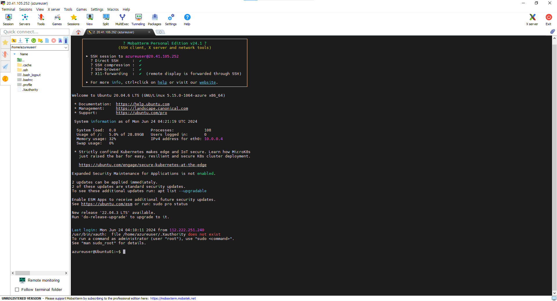 + cmd로 ssh를 활용하여 VM에 접속해도 상관은 없으나 보다 편리하게 접속 및 관리를 할 수 있게 도와주는 여러 Tool들이 존재합니다. 대표적으로 MobaXterm이 있으며, 해당 프로그램을 활용하여 아래와 같이 접속 후 관리하는 것도 가능하니 참고하시면 되겠습니다.