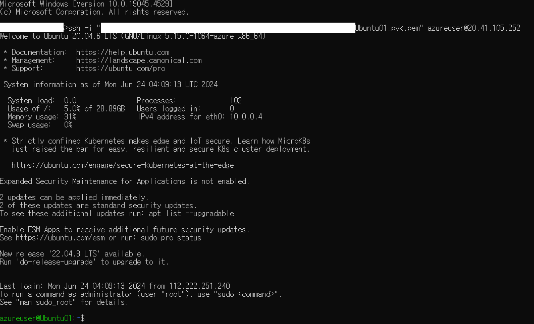 ssh -i {private key파일위치} {VM 생성시 설정한 admin계정}@{ip주소}