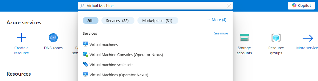1. Azure Portal에 접속 후 검색 창에 Virtual Machine을 검색한 후 Create를 클릭하여 신규 VM을 생성합니다.