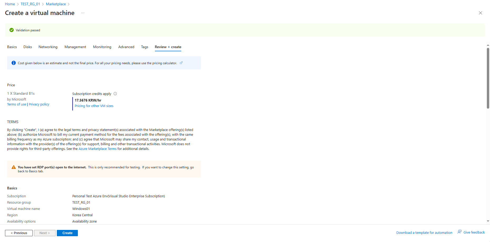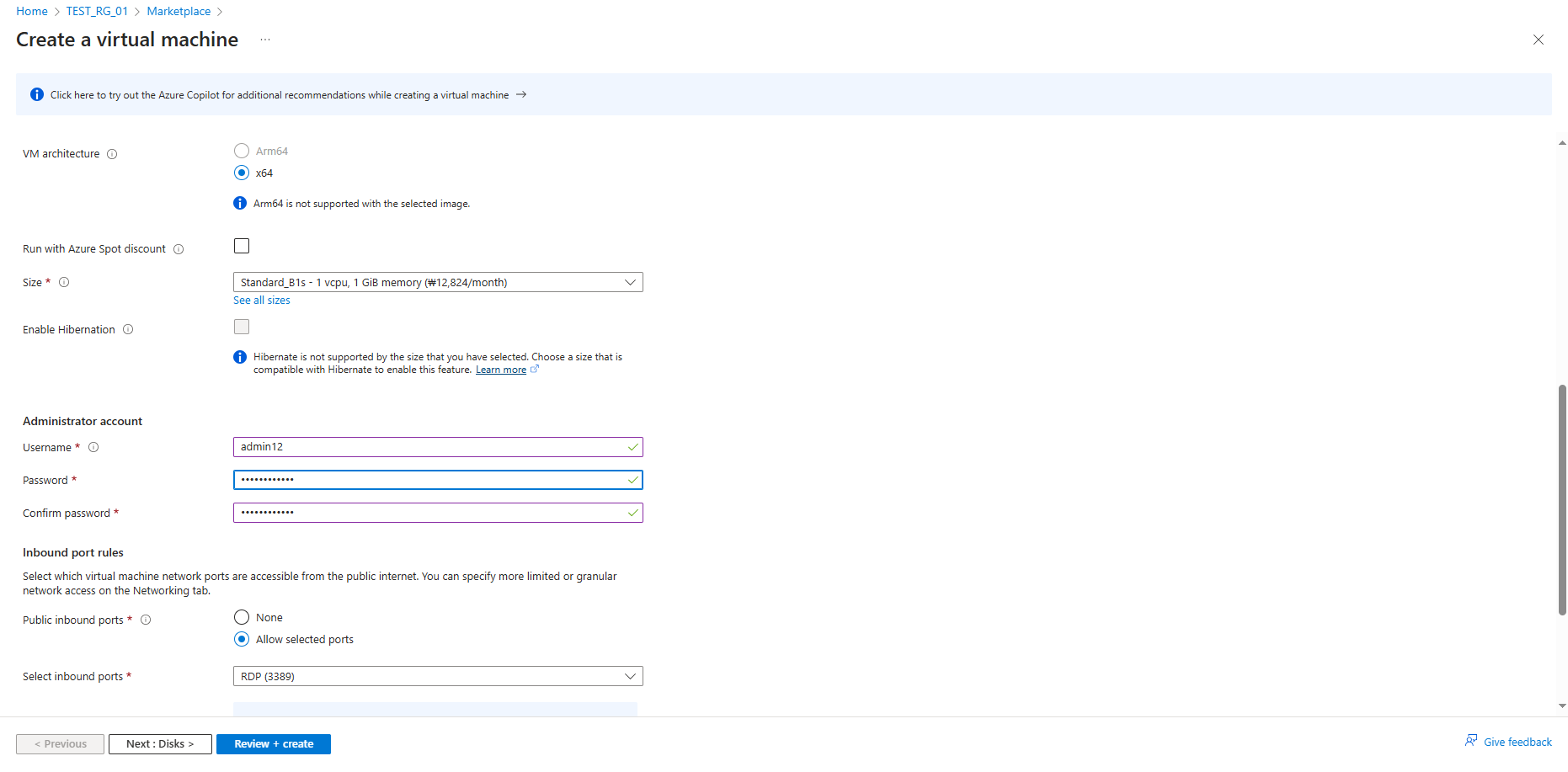 2. 상황에 맞게 VM에 적용할 Option들을 선택한 후 Review + Create를 클릭하고, 최종적으로 Create를 클릭하고 생성될 때까지 대기합니다.(Windows는 기본적으로 VM 접속을 위해서 RDP를 제공합니다. RDP를 이용하기 위해서는 ID, PW를 꼭 필요하니 참고 바랍니다.)
