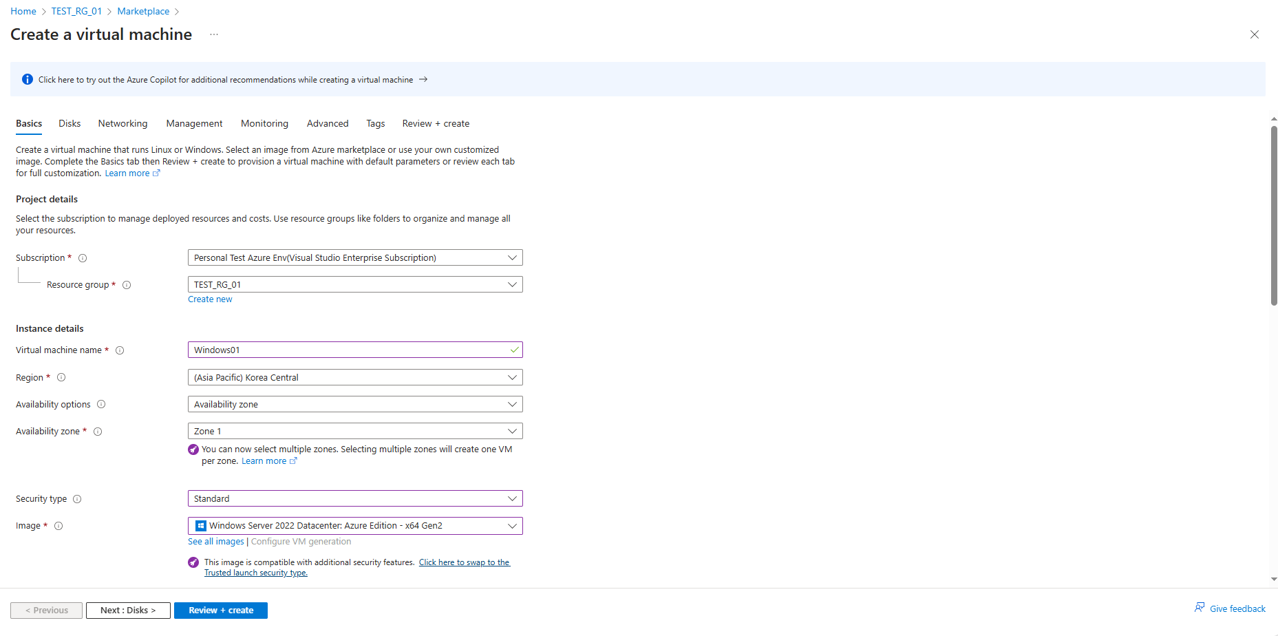 ㆍResource Group: VM 생성에 사용할 Resource Group 선택