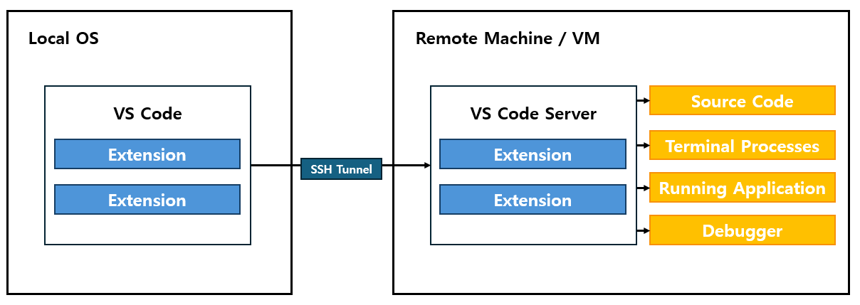 구조도에서 확인할 수 있듯이 VS Code에서 작업을 해도 Remote Machine / VM의 Local에서 작업하듯이 코드 개발, 실행, 테스트 등을 수행할 수 있기에 VS Code의 다른 Extension들과 연계하여 사용할 수 있습니다.