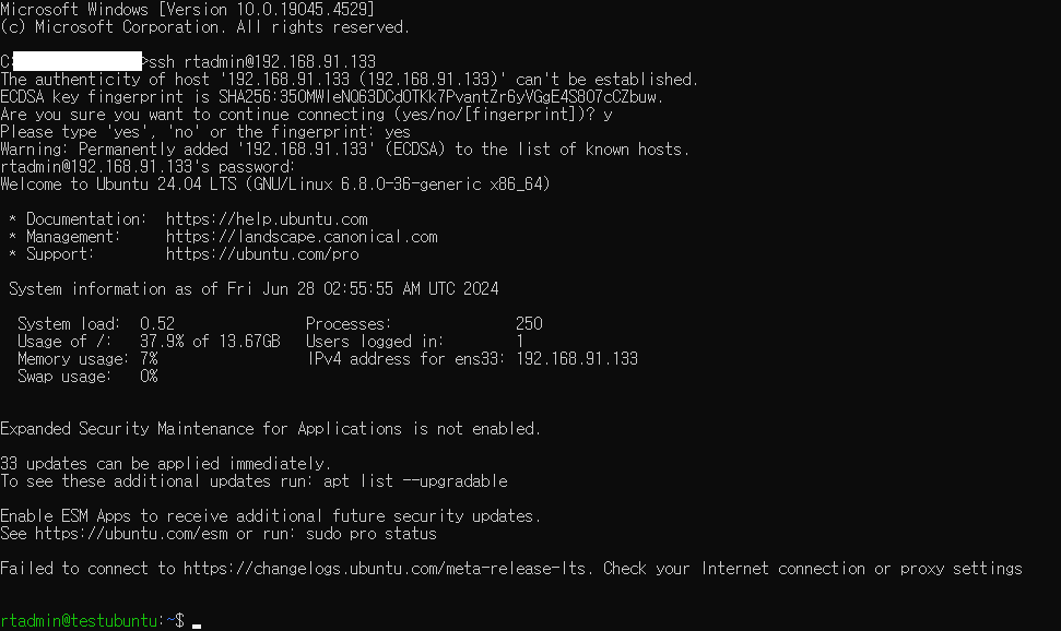 Ubuntu 서버를 설치 후 최초로 접속하면 SSH를 사용하기 위한 설정이 되어 있지 않기에 접속을 시도하면 실패하게 되며 이를 해결하기 위해서는 SSH 사용을 위한 패키지 설치 및 포트(22) 오픈과 같은 설정들이 필요합니다.