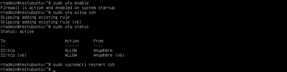 openssh-server를 설치하고 정상적으로 실행되는 것을 확인했다면, 방화벽에서 Inbound Rule을 수정해줘야합니다. ubuntu는 기본적으로 UFW라고 불리는 방화벽 시스템이 있고, 해당 방화벽 시스템에서 SSH 포트(22)를 열어줘야합니다.