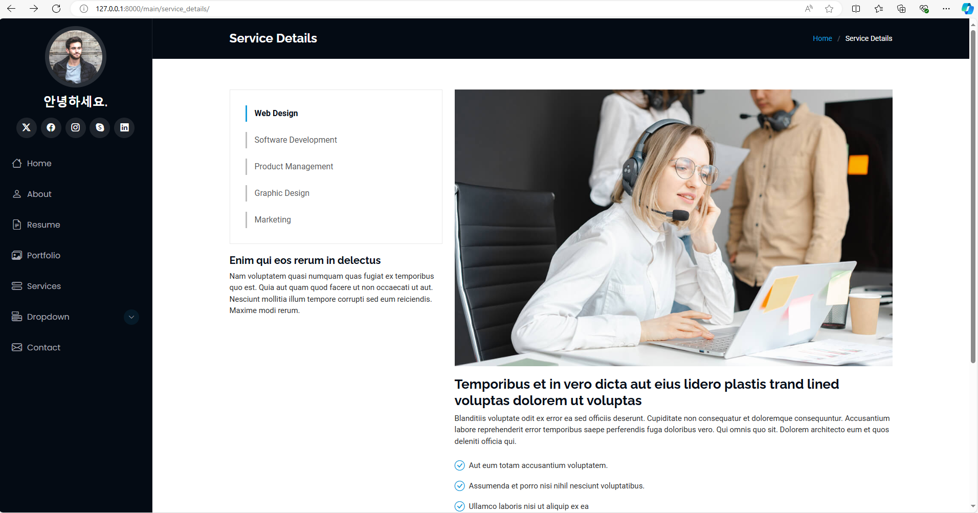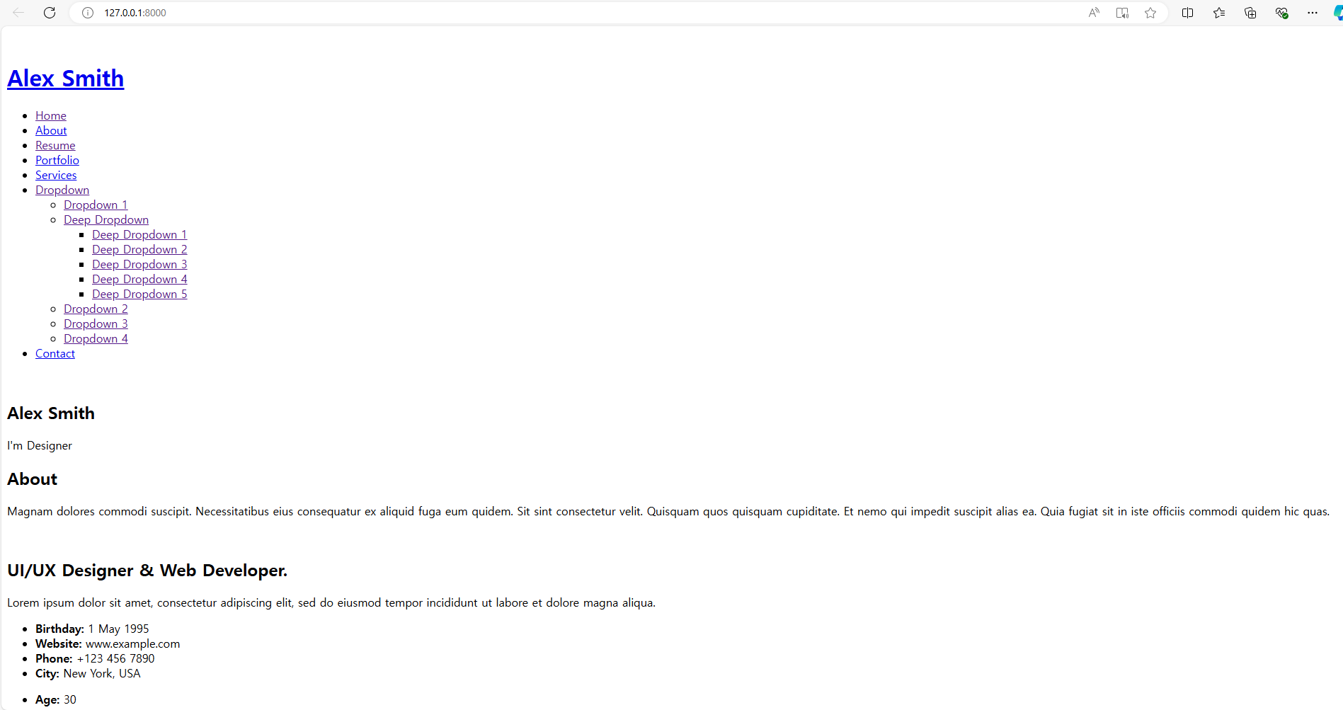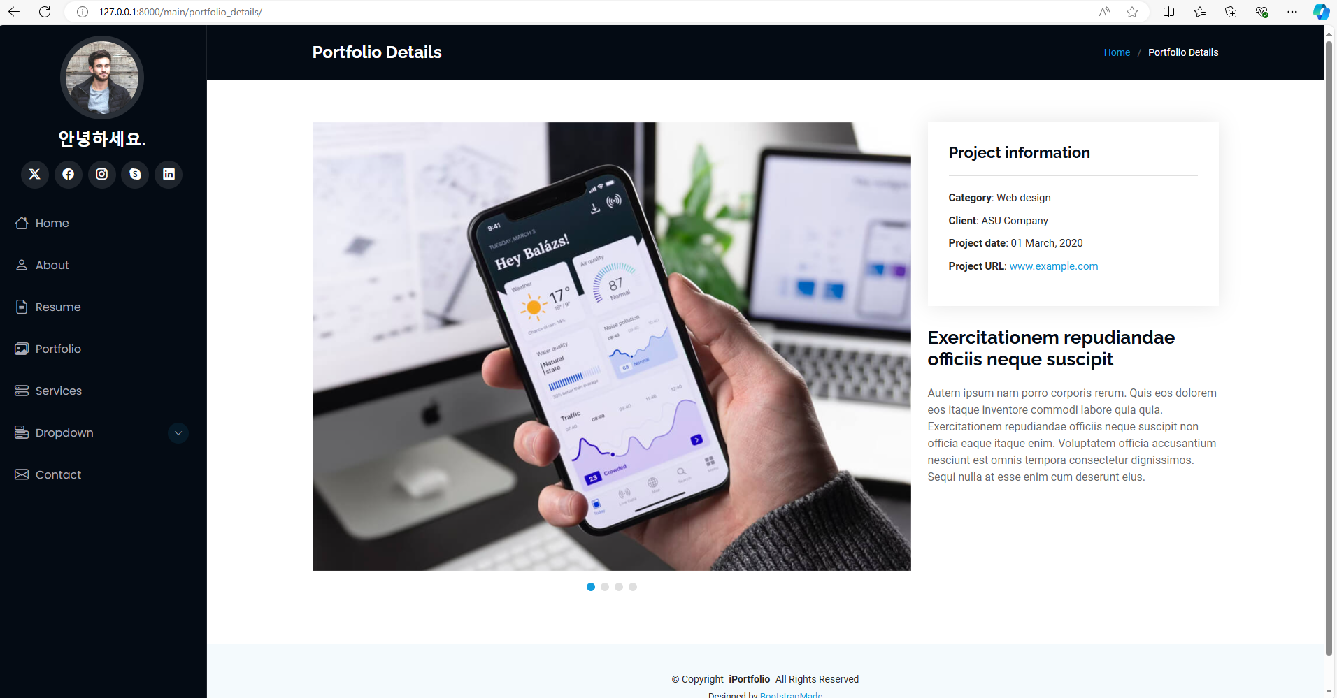 변경한 html 내용도 잘 적용되고, 각 페이지들도 정상적으로 작동하는 것을 확인한 후에는 html 파일들의 내용을 포트폴리오에 맞게 수정해주었습니다. 특정 페이지에서 버튼 클릭시 다른 페이지로 이동하는 기능 구현과 페이지 내부의 불필요한 메뉴 삭제 및 사진 교체 등의 작업들을 진행했는데 해당 부분들은 개인의 필요에 맞게 작성해야하는 부분이기에 해당 부분은 별도로 다루지 않았습니다.