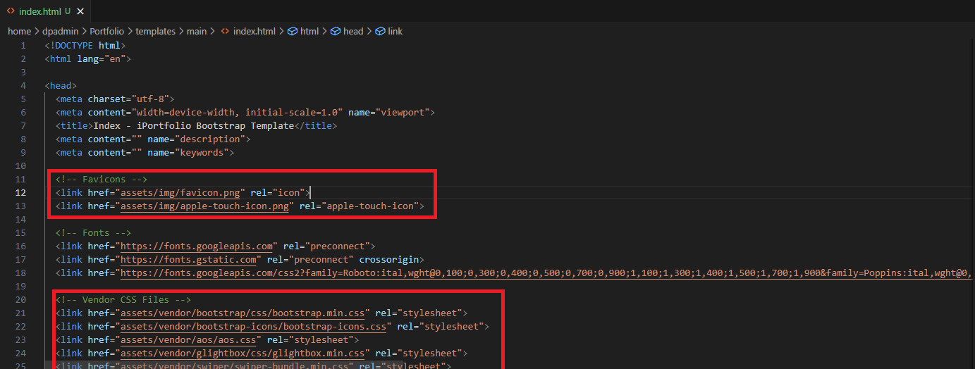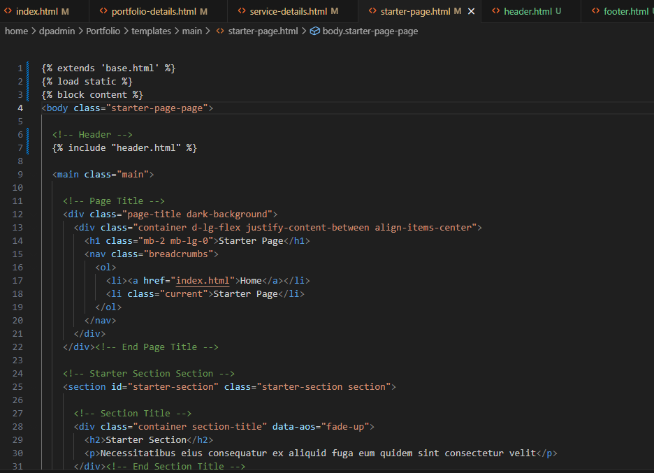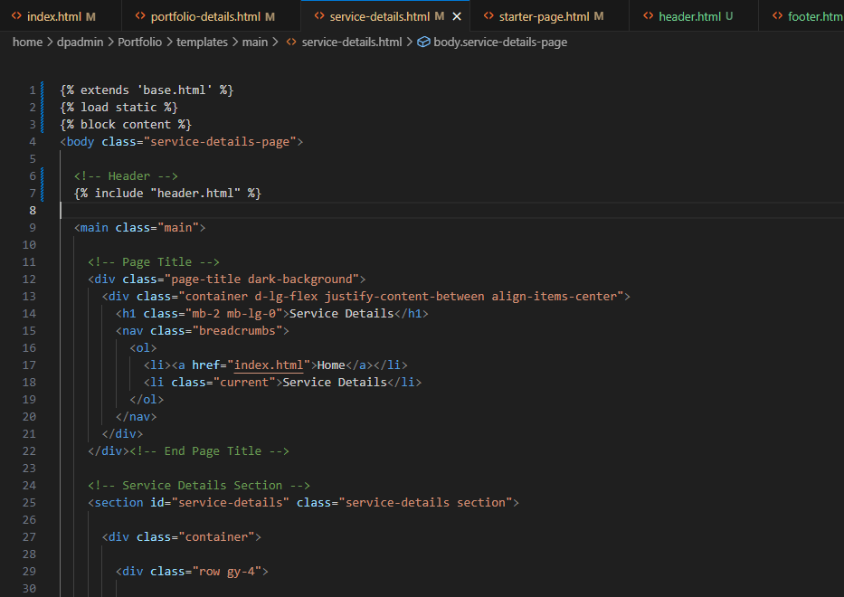문제를 해결하기 위해 index.html에 최상단에 django에서 지정한 static파일들의 기본경로를 불러오기 위해 "{% load static %}"을 입력해주고 href와 src의 경로가 "assets/~"로 이루어져있는 경로들을 "{% static '{파일경로}' %}" 형태로 변경해주었습니다.