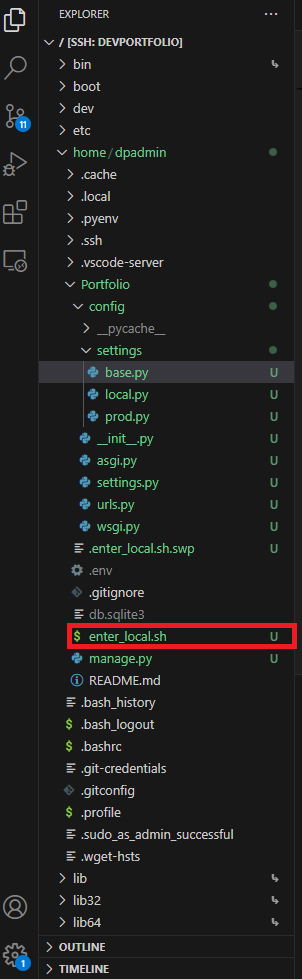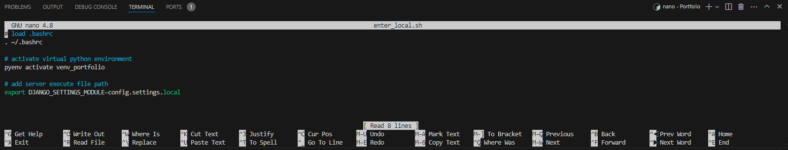 Django는 프로젝트를 생성하면 자동적으로 UTC를 기준으로 Time zone이 설정되게 되기에 기준을 한국 시간대로 변경하기 위해 [config]-[settings]-[base.py] 파일의 LANGUAGE_CODE와 TIME ZONE을 한국시간대로 변경해주었습니다. 변경을 완료한 이후에는 Django실행 시, 개발환경에서 local.py를, 운영환경에서는 prod.py를 사용하게끔 변수값을 지정해줘야하기에 로컬환경에서의 서버 실행을 위한 가상환경 설정을 자동화 시켜줄 bash 코드문을 아래와 같이 작성해주고 기존의 settings.py를 삭제한 이후, '. enter_local.sh' 명령어를 실행하여 가상환경 진입 후 정상적으로 Django 서버가 작동하는지 확인해주었습니다.