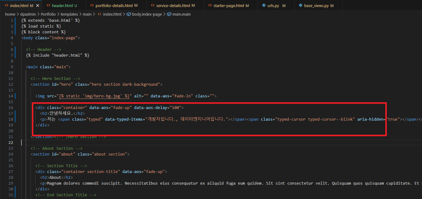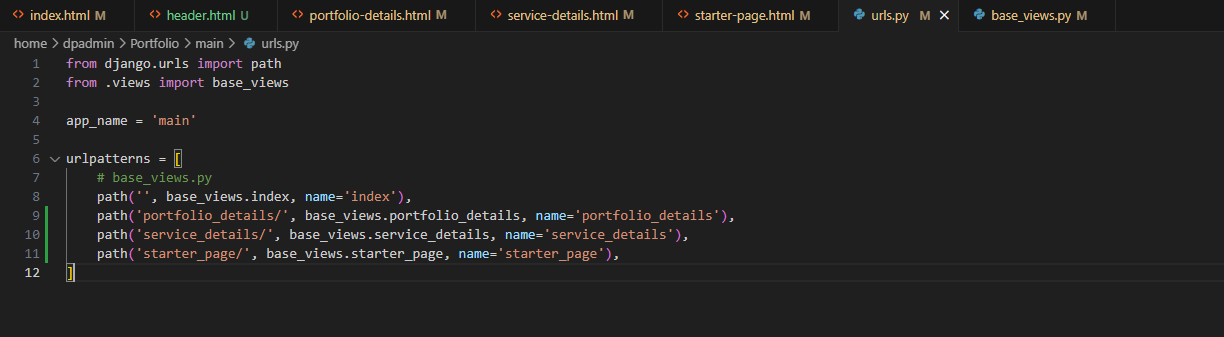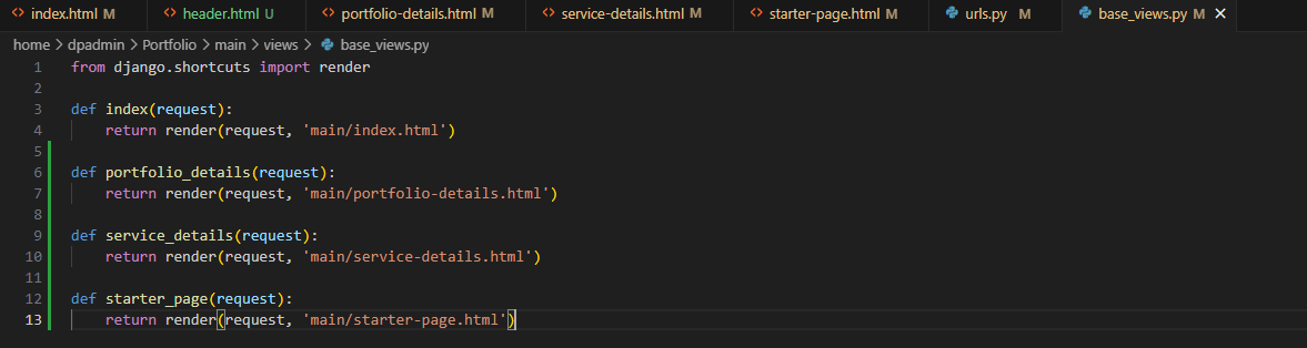 html 파일들을 수정한 후에는 urls와 views의 매핑을 위해 main app의 urls.py와 [views] 폴더 내 base_views.py를 수정해주었습니다.