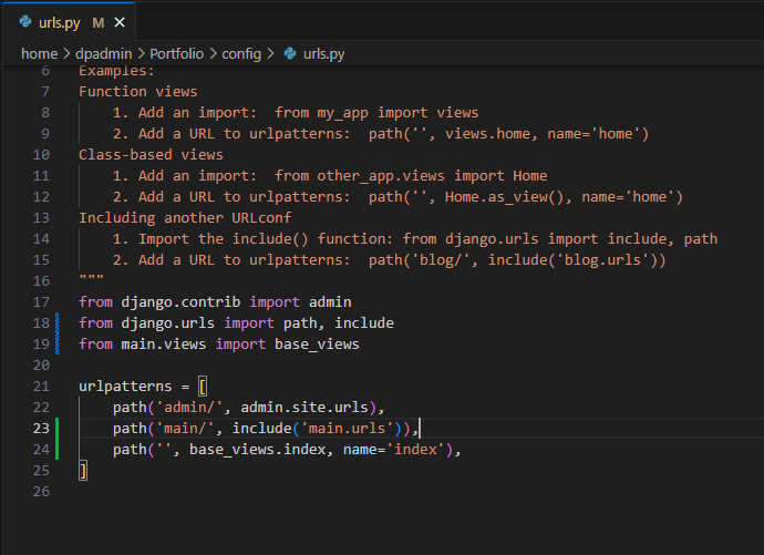 전송해온 bootstrap 파일이 정상적으로 작동하는지 확인하기 위해서는 config의 urls.py를 수정한 후 main app에 urls.py 파일을 생성 및 작성하고 views.py을 수정해줘야합니다. 가장 먼저 config의 urls에 main app을 찾을 수 있게 아래의 사진과 같이 수정해주었습니다. 이후 main app 내에서 추가될 기능들에 대한 내용을 범주별로 묶어주기 위해서 main app 내부의 views.py파일을 삭제하고, main app 내부에 views폴더를 생성한 후 base_views.py파일을 views 폴더 내에 생성해주었습니다. 그 다음 main app 내부의 base_views.py 파일과 urls.py파일을 아래와 같이 수정해주었습니다.