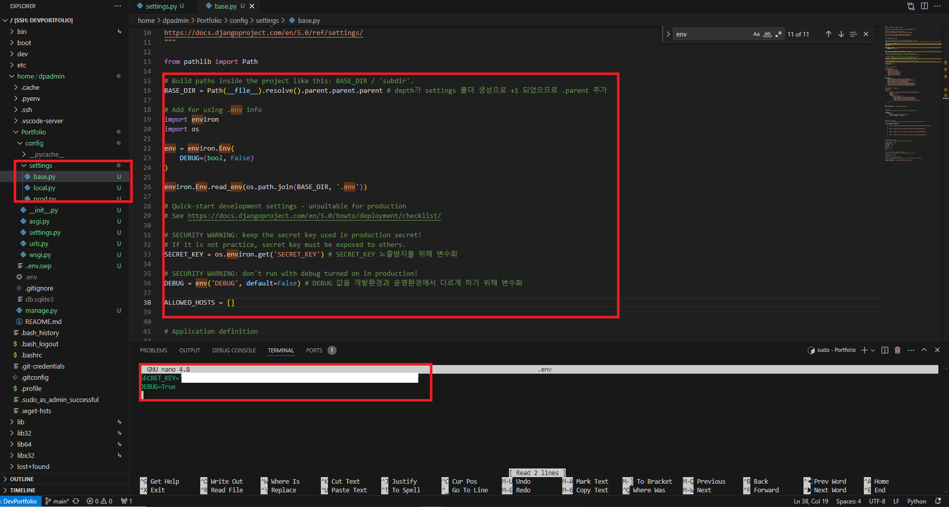프로젝트를 생성하게 되면 자동으로 [config]-[settings.py]가 생성되게 되는데 settings.py에는 SECRET_KEY가 직접적으로 노출되게 됩니다. 배포를 오픈소스 형태로 Github를 통해 진행할 예정이기에 .env 파일을 생성함으로써 이를 변수화하여 실제값을 확인할 수 없게 해주었습니다. 또한 로컬 환경과 운영서버 환경에서 실행하는 settings값의 내용이 달라야하기에 settings 폴더를 config 폴더 하위에 만들고, settings.py의 내용을 base.py(공통), local.py(로컬환경), prod.py(서버환경)로 나누어주었습니다. base.py는 기본적으로 settings.py의 내용을 그대로 복사한 후 BASE_DIR을 수정해주고, SECRET_KEY, DEBUG 값을 .env와 연계하여 사용할 수 있게 적용해주었습니다. 그 다음으로는 개발 시에는 local.py를 운영시에는 prod.py를 사용하게 할 생각이기에 local.py와 prod.py를 모두 작성해줘야 했는데, prod.py는 아직 운영서버를 만들지 않았기에 보류한 후에 local.py파일만 아래와 같은 코드로 작성해주었습니다.