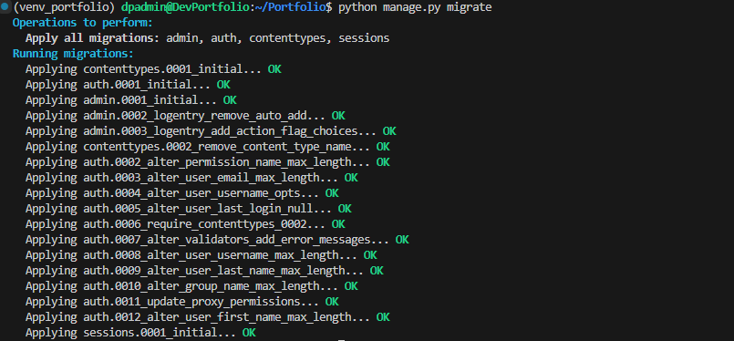 로컬환경에서 django가 정상적으로 실행되는 것을 확인한 후에는 Django 구동 시 필요하지만 아직 설치되지 않은 사항들을 적용하기 위해 아래의 코드를 통해 필요 사항들을 적용시켜주었습니다.