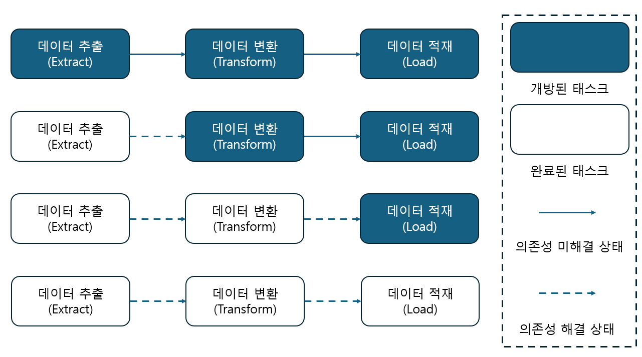 위와 같은 그래프처럼 방향성과 끝점(directed edged)이 포함되어 있으면서 반복이나 순환을 허용하지 않는 그래프를 방향성 비순환 그래프(Directed Acyclic Graph, DAG)라고 부르며, 그래프가 정상적으로 동작하기 위해서는 태스크 간의 순환 실행을 방지하는 비순환 속성이 전제가 되어야 합니다. 순환 실행은 순환 의존성 문제로 연결되어 결국 교착상태(Deadlock)로 이어지게 되기 때문에 그래프의 실행과 동작을 위해서는 반드시 지켜져야 합니다.