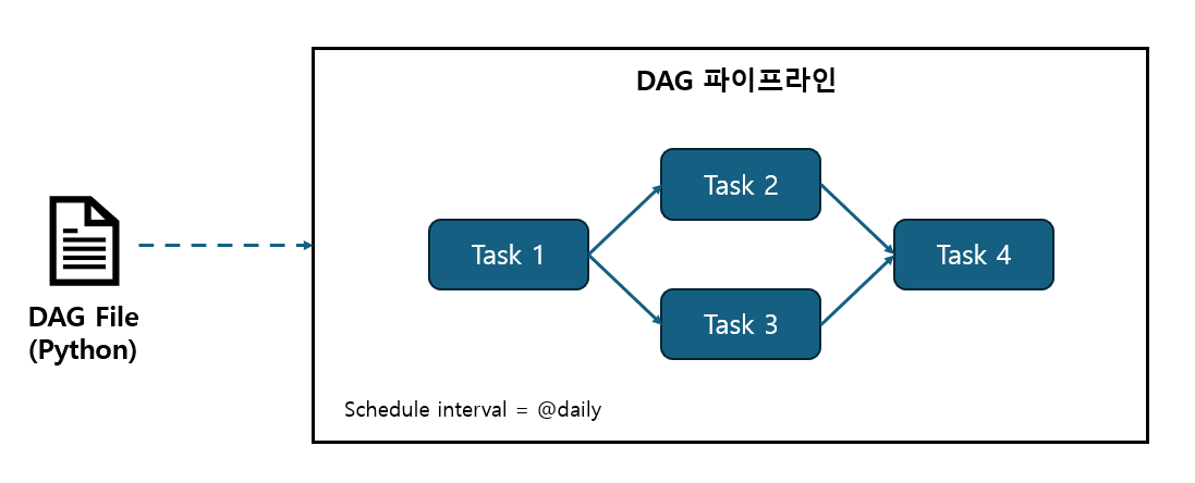 Airflow는 위에서 설명한 WMS 도구들 중 하나로 파이프라인이나 Workflow 태스크를 DAG로 정의할 수 있고, Python 스크립트로 DAG의 구조를 설명하고 구성할 수 있습니다. 일반적으로 각 DAG 파일은 주어진 DAG에 대한 태스크 집합과 태스크 간의 의존성을 기술하고, Airflow는 DAG 구조를 식별하기 위해 코드를 파싱(parsing)합니다. 이외에도 DAG파일에는 Airflow의 실행 방법과 시간 등과 같은 추가 메타데이터가 포함될 수 있다는 특징이 있습니다.
