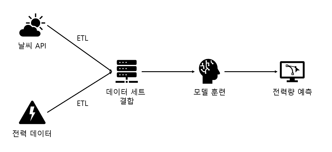 위와 같은 그래프 파이프라인 표현은 태스크 간의 의존성을 직관적으로 설명해 준다는 이점을 가지지만, 파이프라인에 작성된 태스크가 많을 경우 한눈에 알아보기 어려울 수도 있습니다. 이를 해결하기 위해 공통적인 특징을 가지는 태스크들을 묶어서 더욱 간단하게 선형 체인(Linear chain)의 형태로 표현할 수도 있으며, 대표적인 예시로 날씨 데이터와 전력 데이터를 연계하여 머신러닝 모델을 훈련시키는 파이프라인을 아래와 같이 표현하는 것을 들 수 있습니다.