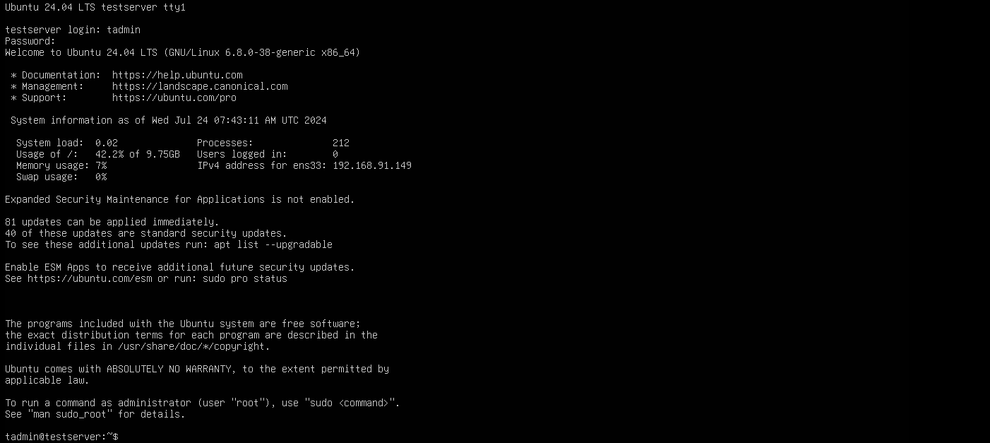 설치는 '시작하세요! 도커/쿠버네티스 친절한 설명으로 쉽게 이해하는 컨테이너 관리'를 기반으로 진행하였으니 참고 바랍니다. VMware를 사용하여 최초로 Ubuntu 서버를 실행시키면 아래와 같이 로그인 화면이 나오며, Ubuntu 생성 시 작성한 admin 계정으로 로그인을 하면 Ubuntu server로 들어갈 수 있습니다.