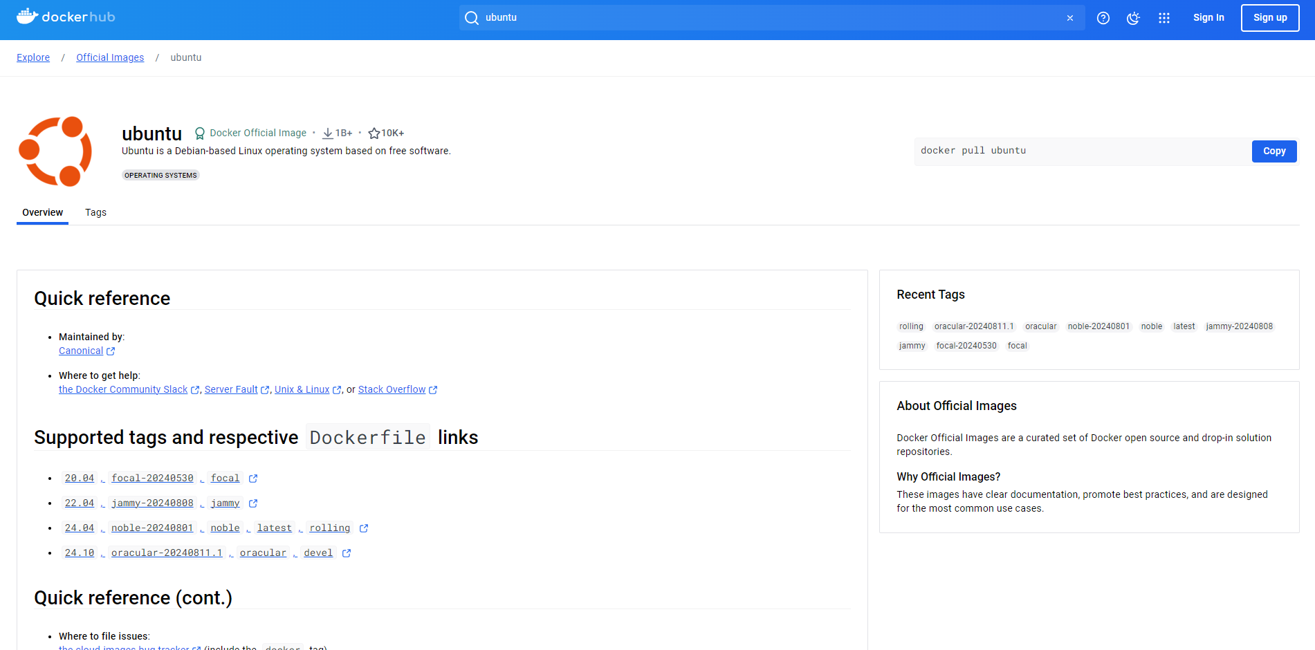 도커 허브에 존재하는 이미지의 종류를 살펴보기 위해서는 도커 허브 사이트를 직접 접속하여 찾아볼 수도 있고, docker serach 명령어를 사용할 수도 있습니다. 이를 실제로 알아보기 위해 ubuntu와 관련된 이미지를 검색해 보았습니다.