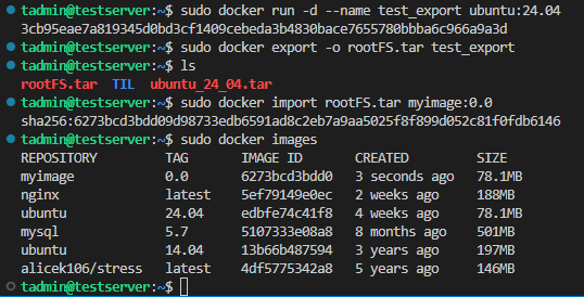 다만 이미지를 단일 파일로 저장하는 것은 효율적인 방법이 아니며, 추출된 이미지는 레이어 구조의 파일이 아닌 단일 파일이기 때문에 여러 버전의 이미지를 추출할 경우 이미지 용량을 각기 차지하게 됩니다. 즉, ubuntu:24.04 이미지와 ubuntu:24.04 이미지를 기반으로 일부 수정하고 추출한 이미지가 있다면 ubuntu:24.04 이미지 2개 크기 이상의 용량을 차지하게 된다고 볼 수 있습니다.