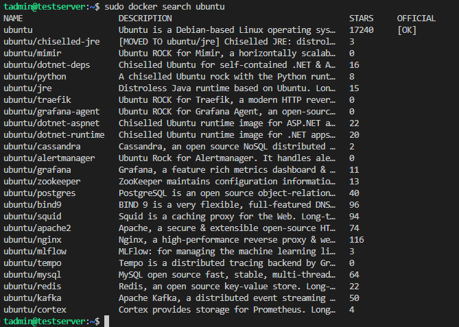 출력된 결과물을 통해 ubuntu 이미지도 다양하게 존재하는 것을 확인할 수 있었고, STARS의 수치를 통해 해당 이미지가 얼마나 사용자들로부터 즐겨찾기로 추가되어 있는지도 확인할 수 있었습니다.