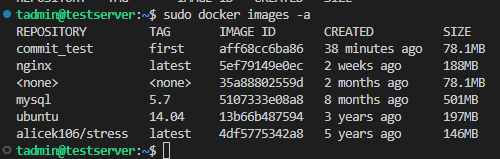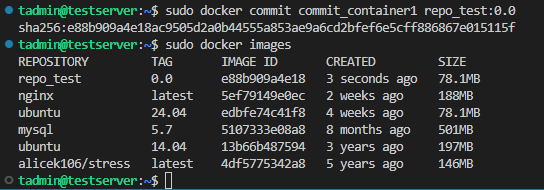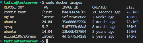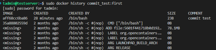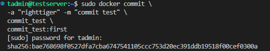 저장소 이름은 입력하지 않아도 상관없으나 이미지 태그를 입력해주지 않으면 자동으로 latest로 설정됩니다. 위의 예시에서는 이미지 이름을 commit_test로 태그를 first로 설정해 주었고, -a 옵션으로 작성자를, -m 옵션으로 커밋 메시지를 설정해 주었습니다. 이후에 docker images 명령어를 통해 정상적으로 생성되었는지 확인해 주었습니다.