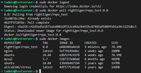 출력결과를 보면 전체 레이어가 repository에 전송된 것이 아니라 1개만 전송된 것을 알 수 있는데 이는 해당 이미지가 ubuntu:24.04를 기반으로 만들어졌기 때문입니다. 즉 ubuntu:24.04 이미지의 레이어는 허브의 우분투 이미지 저장소에 존재하므로 거기에서 가져오고 수정된 사항이 기록된 layer만 전송한 것을 확인할 수 있습니다. 업로드를 완료한 후에는 생성했던 저장소의 Tags메뉴에 들어가 보면 정상적으로 업로드된 것을 확인할 수 있으며, 업로드가 완료된 이미지는 pull명령어로 다운로드할 수 있습니다. 실제로 다운로드가 잘 되는지 보기 위해 기존의 컨테이너와 이미지들을 삭제해 주고 해당 이미지를 다운로드해보았습니다.