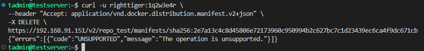 매니페스트와 레이어에 부여된 다이제스트는 레지스트리 컨테이너에 저장된 이미지를 제어할 때 사용되며, 이미지의 삭제를 위해서는 매니페스트와 레이어 파일을 따로 삭제해줘야 합니다. 실제로 해당 내용이 어떻게 작동하는지 확인해 보기 위해 아래의 명령어를 활용하여 매니페스트를 삭제해 보았습니다.