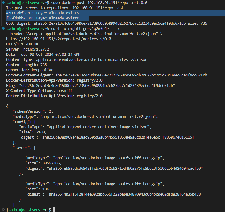 202 Accepted 메시지가 반환되면 해당 이미지의 매니페스트가 정상적으로 삭제된 것입니다. 다만 이는 실제 이미지 레이어 파일이 아닌 매니페스트 파일만 삭제된 것이기 때문에 같은 이미지를 다시 push하면 Layer Already Exist라는 출력 결과를 확인할 수 있으며, 이를 실제로 확인해보기 위해 다시 push 해보았습니다. push 결과 해당 메세지가 출력되는 것과 삭제되었던 매니페스트도 다시 생성된 것을 확인할 수 있었습니다.