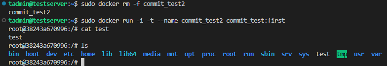 sudo docker run -i -t --name commit_test2 commit_test:first