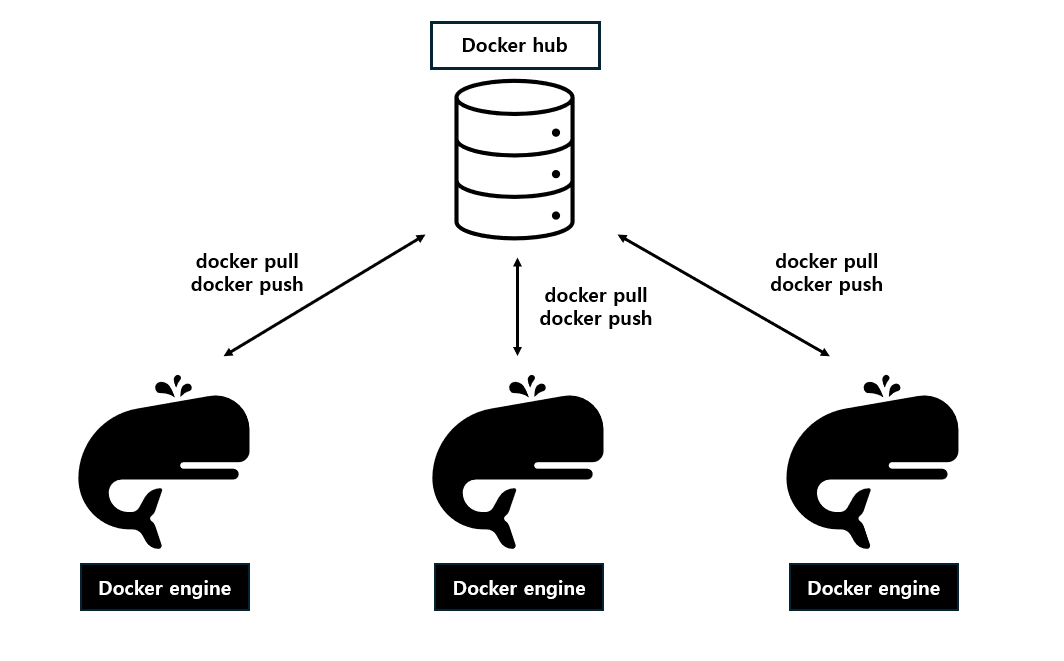 이를 해결할 첫 번째 방법은 Docker에서 공식적으로 제공하는 도커 허브(도커 이미지를 저장하기 위한 클라우드 저장소) 이미지 저장소를 이용하는 방법으로 사용자는 docker push 명령어로 이미지를 올리고 docker pull 명령어로 이미지를 내려받으면 되므로 매우 간단하게 사용할 수 있습니다. 다만 비공개(private) 저장소를 일정량이상 사용하기 위해서는 결제를 해야 한다는 단점이 있습니다.