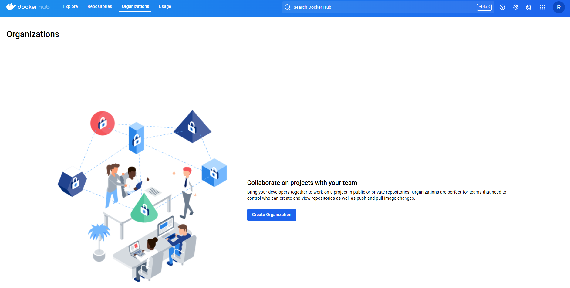 위에서 알아본 저장소 사용방법은 단일 계정에서 저장소를 생성 후 이미지를 저장하는 방법이었습니다. 만약 다른 개발자들과 함께 이미지를 개발하는 상황이라면, 저장소의 이미지 읽기, 쓰기, 수정 및 관리와 같은 권한과 조직 구성을 통한 체계화가 필요할 수 있기에 DockerHub에서는 조직과 팀 단위로 이미지 저장소를 이용할 있게 Organizations, Teams로 구성하는 것도 가능합니다. 실제로 조직을 생성하고 사용해 보기 위해 도커허브 홈페이지의 상단 메뉴에서 [Organizations]를 선택한 후 [Create Organization] 버튼을 클릭해 보았습니다. 무료로 이용이 가능했던 과거와 달리 정책이 변경되어 조직 및 팀으로 저장소를 사용하기 위해서는 일정 금액을 지불해야 하는 것을 확인할 수 있었습니다.(2024년 10월 2일 기준)