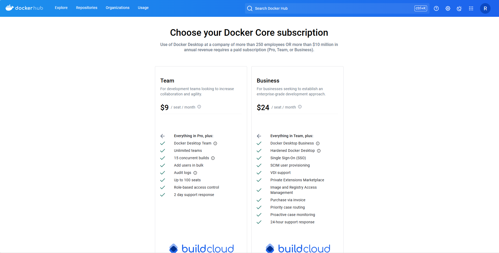 단, 도커 허브는 누구나 이미지를 올릴 수 있기 때문에 공식(Official) 라벨이 없는 이미지는 사용법을 찾을 수 없거나 제대로 동작하지 않을 수 있습니다. 또한 이미지 저장소를 비공개(Private)로 사용하기 위해서는 비공개 저장소의 수에 따라 요금을 지불해야 합니다.