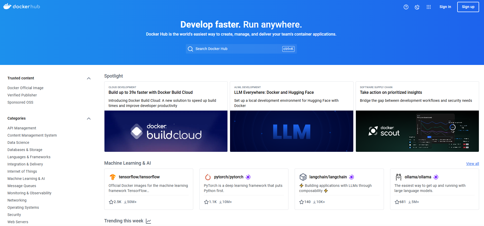 첫 번째 방법을 실제로 진행해 보기 위해 우선 도커 허브 공식 홈페이지에 접속해 보았습니다.