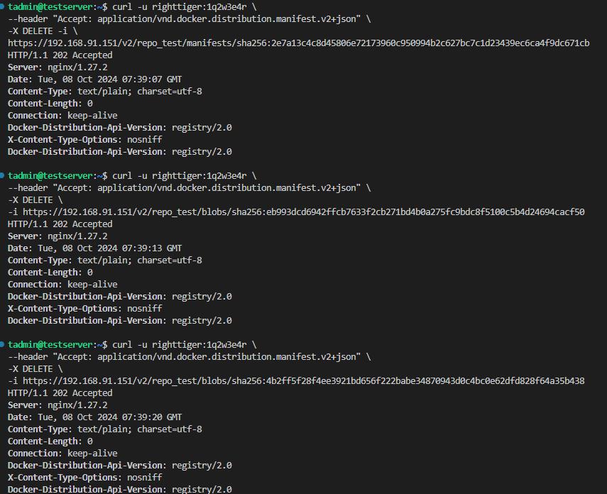 이미지 레이어 파일도 실제로 삭제하려면 각 레이어 파일의 다이제스트를 입력하여 삭제 API를 호출해야 하며, 보다 확실히 알아보기 위해 아래의 명령어를 통해 매니페스트와 레이어를 직접 삭제해 보았습니다.