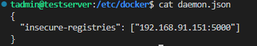 정상적으로 이미지의 접두사를 수정했음에도 HTTPS관련 오류가 위와 같이 발생한 것을 확인할 수 있는데 이는 기본적으로 도커 데몬은 HTTPS를 사용하지 않은 레지스트리 컨테이너에 접근할 수 없기 때문입니다. HTTPS를 사용하려면 인증서를 적용해 별도로 설정해야 하며, 지금은 간단하게 테스트만 해보기 위해 HTTPS를 사용하지 않아도 push, pull이 가능하게 아래의 옵션을 Docker 시작 옵션에 추가한 뒤 도커를 재시작하였습니다.(ubuntu 24.04 버전 기준)