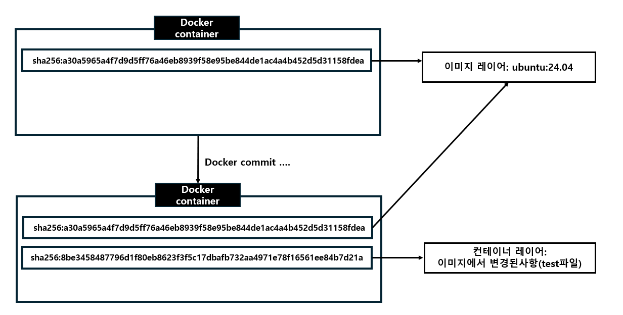 출력결과에는 다양한 정보들이 존재하지만 주의 깊게 살펴봐야 하는 항목은 Layers 항목으로, commit을 통해 변경 사항을 저장할 때 이미지를 이루는 파일들을 전부 복사해서 새롭게 만들어 놓는 것이 아니라 기반이 되는 이미지에 레이어를 추가하는 형식으로 작성되게 됩니다. 즉, ubuntu:24.04을 기반으로 test_commit:first라는 이미지를 만들어서 ubuntu:24.04라는 이미지와 test_commit:first라는 이미지가 존재한다고 해도 전체 이미지 크기는 ubuntu:24.04의 크기 + test_commit:first의 크기가 아니라 ubuntu:24.04의 크기 + first파일의 크기가 되게 됩니다. 이는 docker commit 명령어가 수행될 경우 변경사항에 대해서는 layer형태로 저장을 해놓기 때문입니다. 이를 그림으로 표현해 보면 아래와 같습니다.