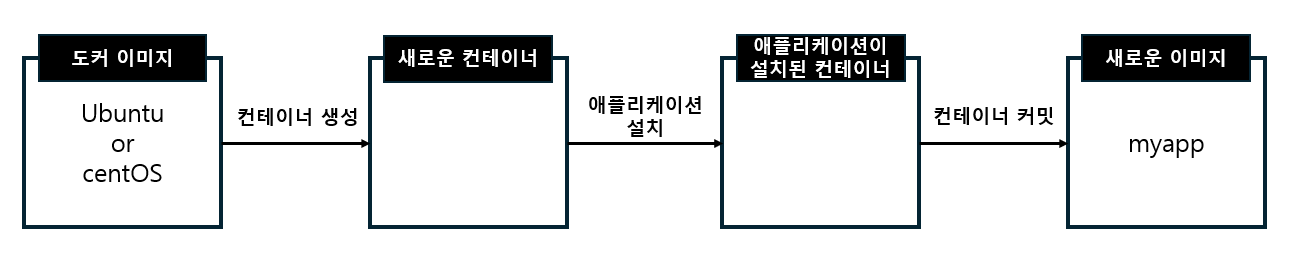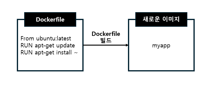 위의 방법을 사용하면 애플리케이션이 동작을 보장할 수는 있지만 환경을 구성하기 위해 일일이 수작업으로 패키지를 설치하고 소스코드를 Git에서 복제하거나 호스트에서 복사해야 하는 번거로움이 있습니다. Docker에서는 이를 보다 간단히 할 수 있게 하기 위해 일종의 파일 형식인 dockerfile을 생성할 수 있게 하고 이를 읽음으로써 이미지를 생성할 수 있게 하는 방법을 지원하며, 이를 그림으로 표현해 보면 아래와 같습니다.