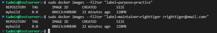 sudo docker images --filter "label=maintainer=righttiger <righttiger@email.com>"